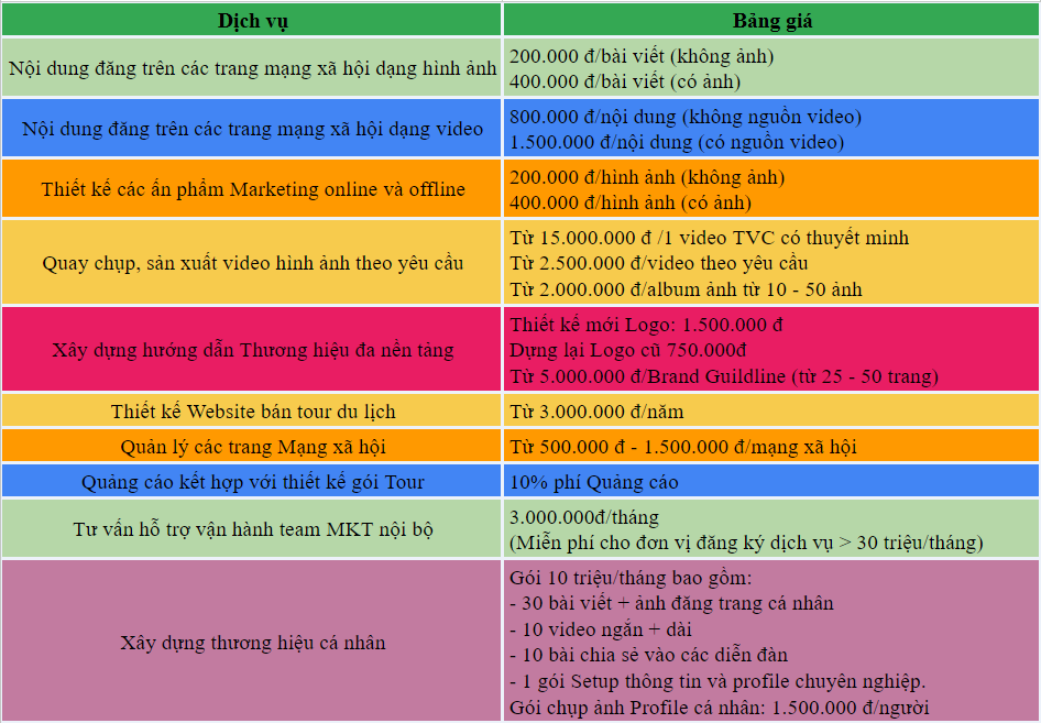 Lưu ý: Bảng giá trên có sự thay đổi linh hoạt theo yêu cầu cụ thể của khách hàng