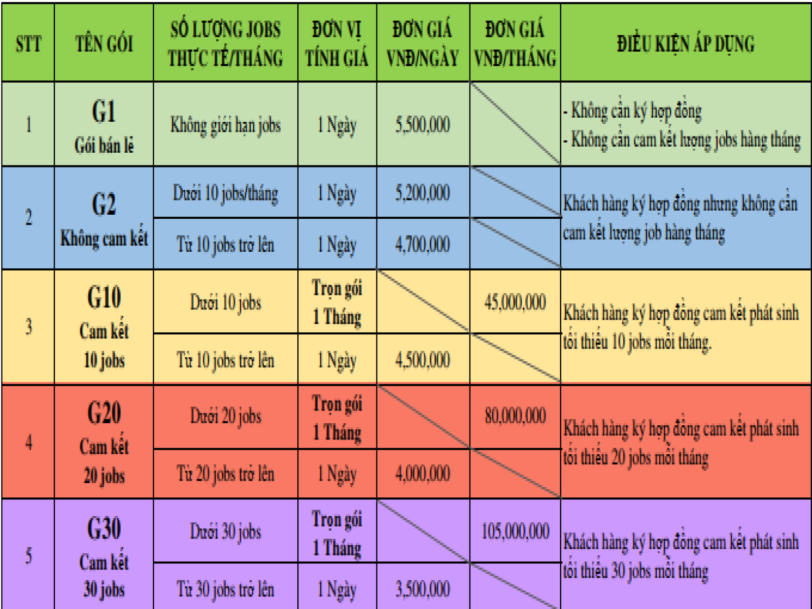 - Chi phí phát sinh đối với jobs nhiều hơn 1 ngày là 1.000.000 VNĐ/ngày (riêng gói G1 là 1.500.000 VNĐ/ngày.